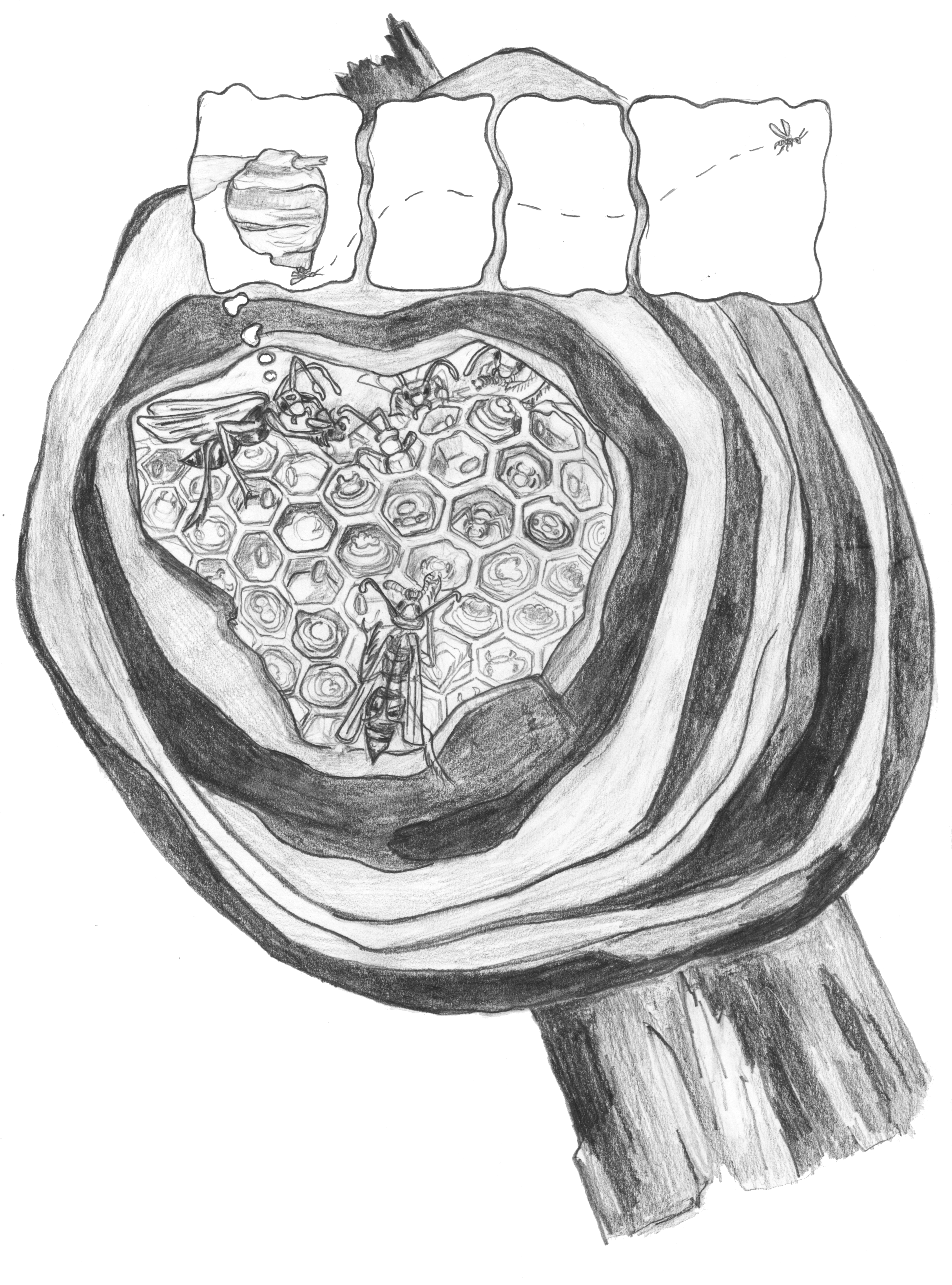 Earl was a wasp. She inhabited a nest made of wood pulp that bulged obscenely from the end of a hollowed-out log. Earl was a worker wasp. Cordial and friendly to her fellow workers, she bzzzzed as she worked, chewing wood into pulp and dutifully facilitating the expansion of the nest. Earl’s bzzz expressed the appropriate contentment towards and resignation to her role in the wasp community, which required also that she defend the nest and provide nourishment to its larvae by paralyzing insects and tearing them apart to transport back to her wards.