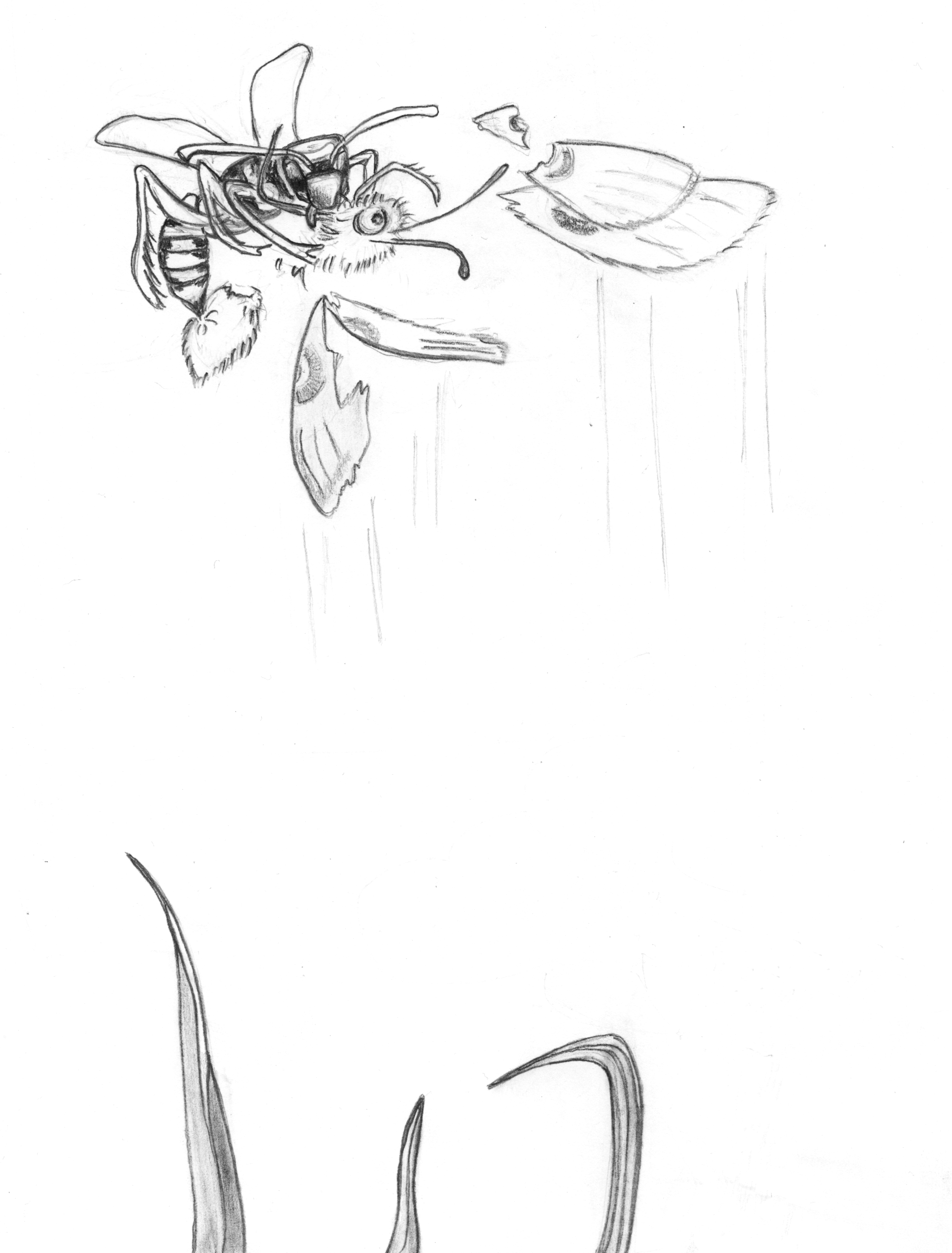 Earl stayed with Ed that day, and the next and the next. When Ed was feeling better and more secure in his body and world Earl went off on a fly to find and paralyze Violet the Furry Moth with her stinger. She chewed Violet into pieces and then she carried the pieces to the nest, where she fed them one by one to her larvae wards who were jiggling in hungry anticipation.